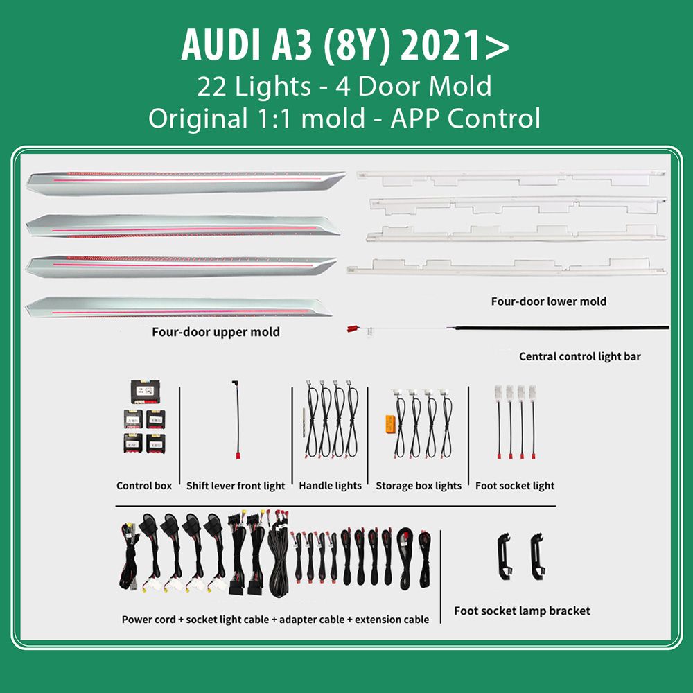 - 18 lights (4-door handle light, 4-door outline light bar, 4-door storage box light bar, 4 footwell lights, 1 central control co-driver through, 1 main driver)