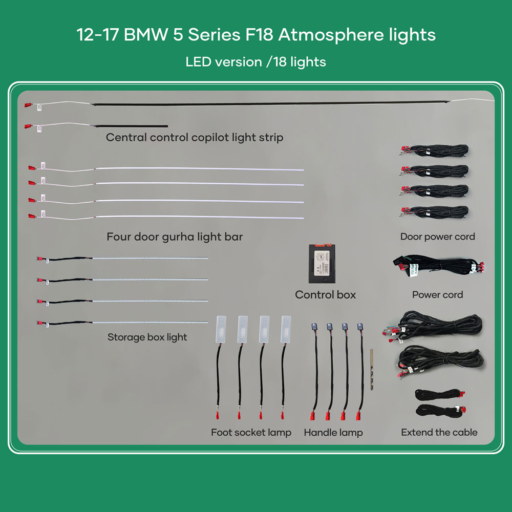 - 18 lights (4 door handle lights, 4 door outline lights, 4 door storage box lights, 4 footwell lights, 1 left of the steering wheel, 1 below the screen).